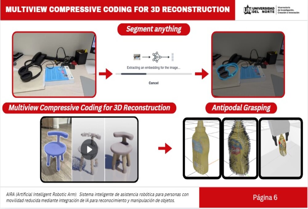 "La idea es que el usuario seleccione un objeto en la pantalla, y mediante inteligencia artificial, el robot detecte y tome el objeto automáticamente", explica el docente. Para lograr esto, el equipo utilizará Segment Anything, una inteligencia artificial desarrollada por META, que permite identificar y reconstruir objetos en 3D para determinar la mejor posición de agarre.